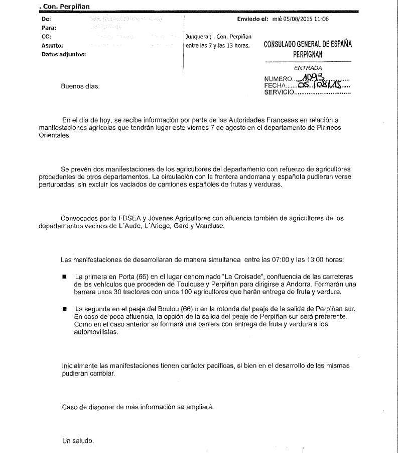 Según la nota de los franceses “ La circulación con la frontera andorrana y española pueden verse perturbadas, sin excluir los vaciados de camiones españoles de frutas y verduras”.