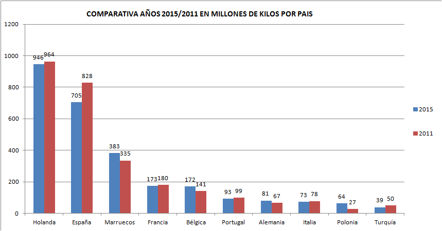 Este hueco ha sido ocupado por Marruecos con un aumento de 48 millones de kilos ,Bélgica que crece en 31 millones, Alemania aumenta en 14 millones y Polonia 37 millones.