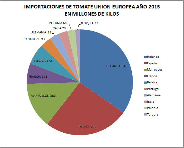 Según datos del ICEX (base de datos Euroestacom, codigo Taric 07020000) las importaciones de tomate de la Unión Europea en el año 2015 alcanzaron los 2.853 millones de kilos con un valor de 3.552 millones de euros.