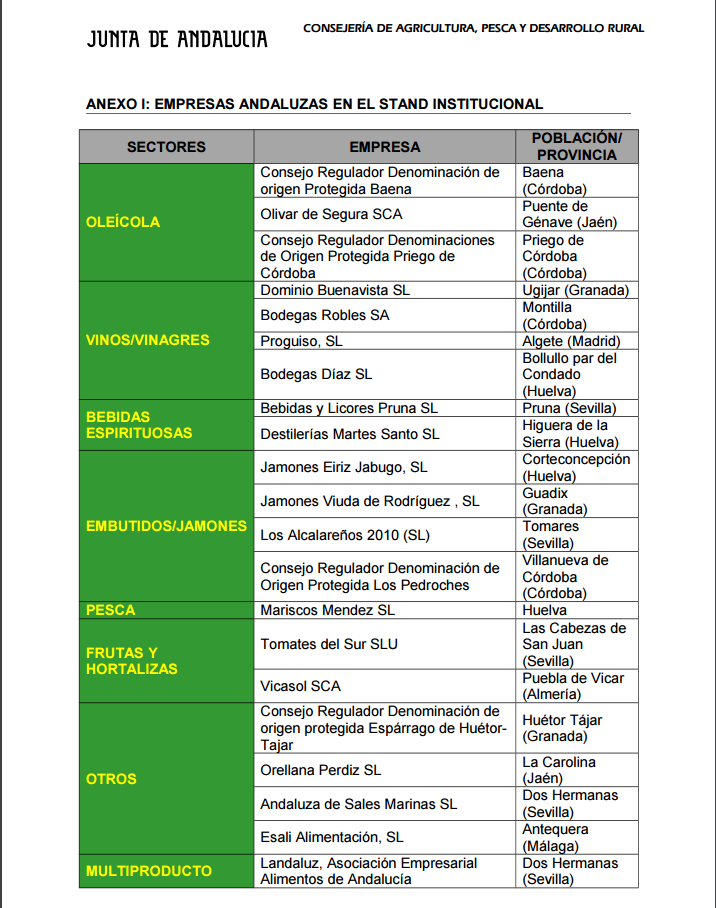 En el siguiente cuadro aparecen las empresas presentes en el pabellon de la Junta de Andalucía.
