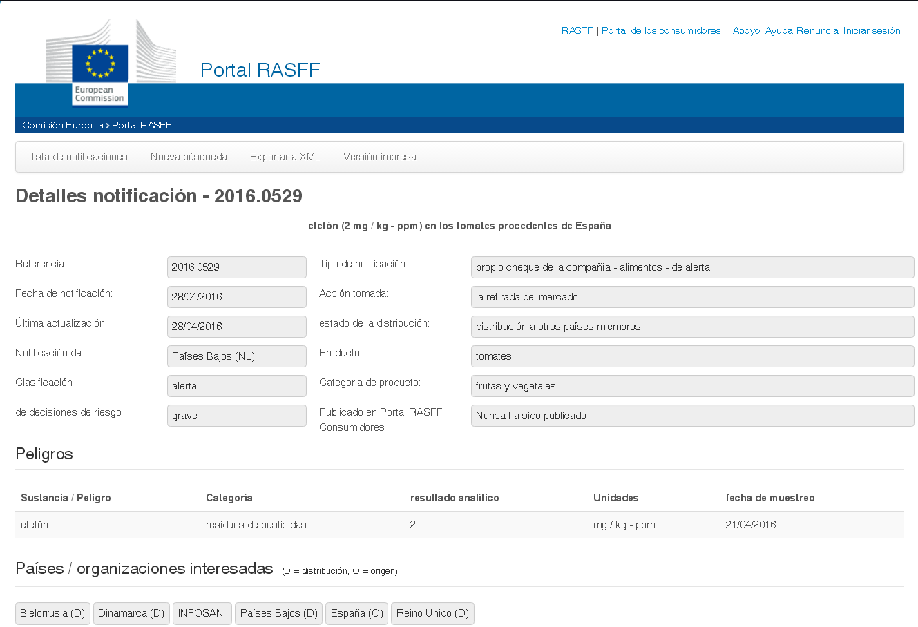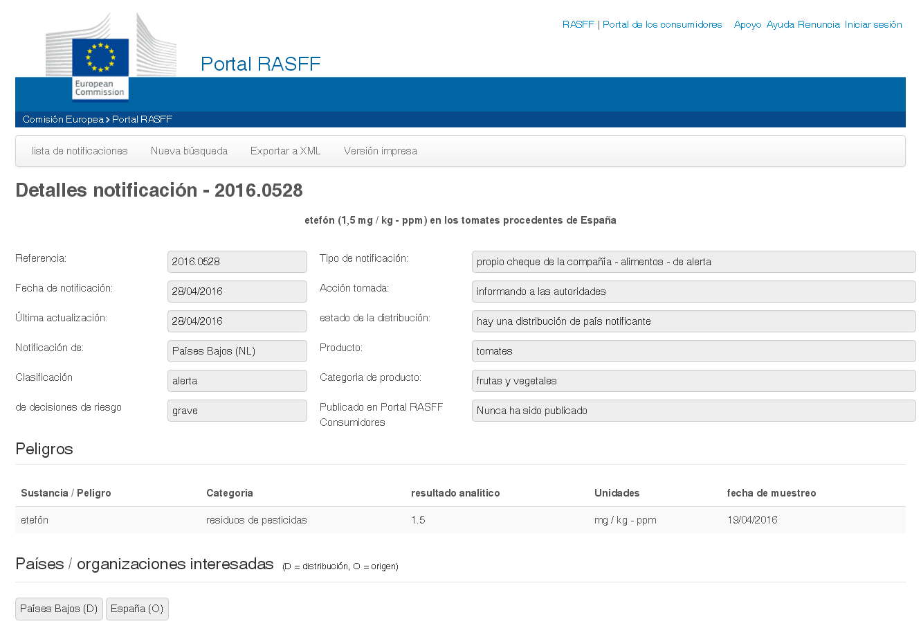 En la primera de ellas se realizó el control el día 19 de abril en una partida de tomates destinada al mercado holandés. Los análisis detectaron el residuo de pesticida Etefón en un nivel de 1,5 miligramos/kilo. El límite máximo permitido para tomate en la UE es de 1 miligramo/kilo. La alerta se ha notificado con fecha 28 de abril, por lo que los tomates ya se habían distribuido en el mercado y la única medida que se tomo fue la de notificarlo a las autoridades.